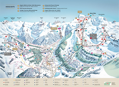 På Titlis finns även flera långa och utmanande pister. Från toppen av Titlis ner till byn är får man en riktig genomkörare på ca 2000 fallhöjdsmeter.